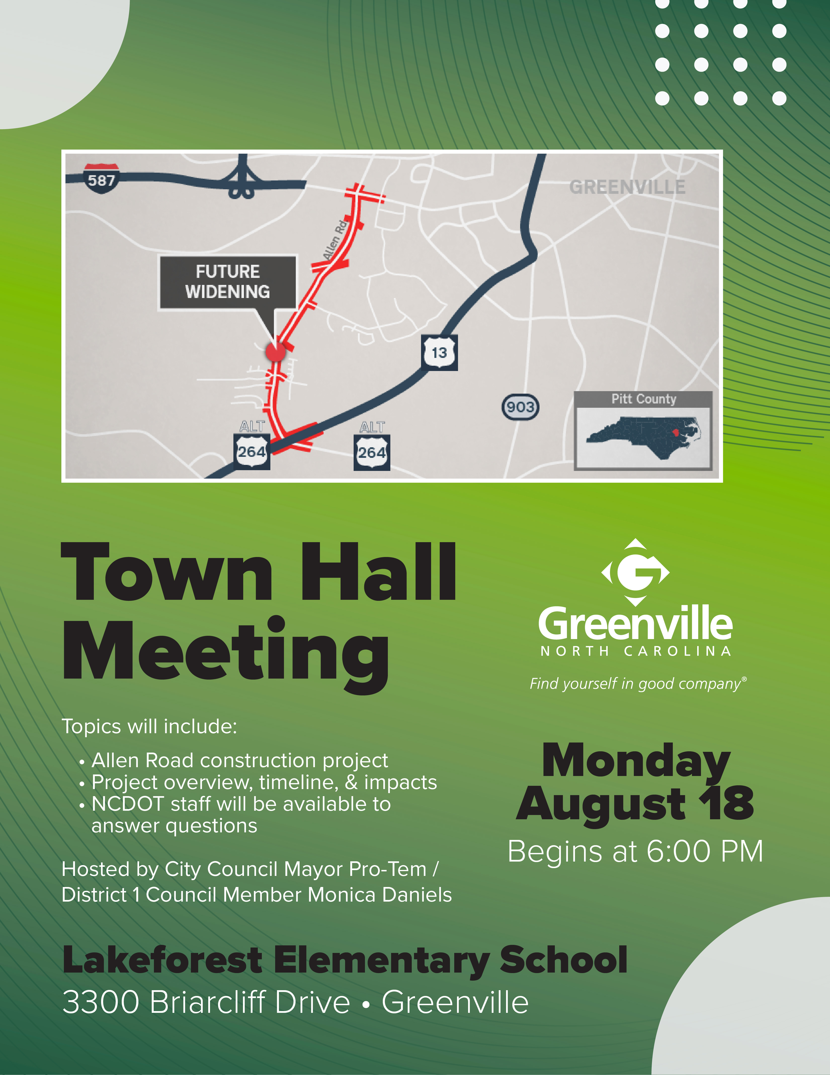 The N.C. Department of Transportation proposes to widen approximately 2.3 miles of Allen Road from two lanes to a four-lane, median-divided roadway from Stantonsburg Road to Dickinson Avenue Extension (U.S. 13) in Greenville.